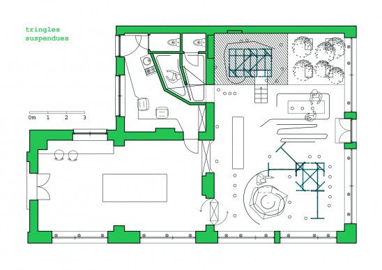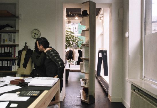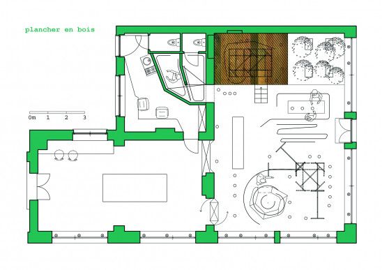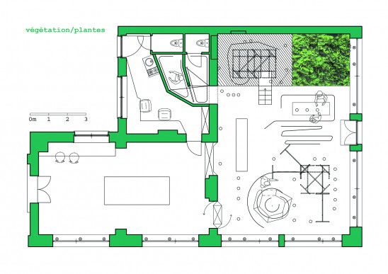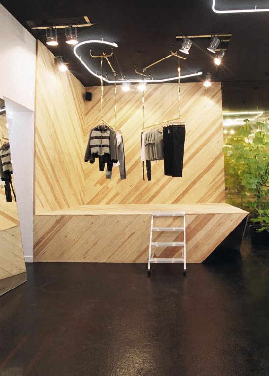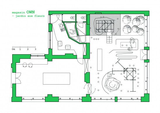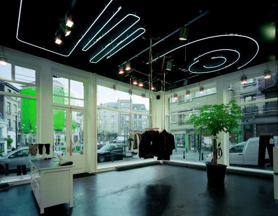 L'absence de vitrine, ou plutôt son extension à l'extrême, amène à un espace qui s'insère de manière naturelle dans son environnement : le magasin est la vitrine, les limites entre l'espace public et l'intérieur du magasin s'estompent. Les formes et les matériaux, empruntés à l'industrie, jouent le jeu du ready-made : une mise en oeuvre architecturale les transforme en des objets pensés mais encore teintés de brut. Le sol s'exprime par un matériau pauvre, l'asphalte, pensé comme clin d’œil à la transparence du magasin sur la rue, prolongation de l'extérieur à l'intérieur. Les luminaires, diversifiés et mis en forme de façon ludique, affirment leur présence et se posent comme une alternative à l'éclairage commercial cru et indifférencié habituel.