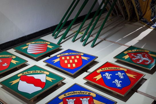 Autant de costumes donc, dans leur version actuelle, mais aussi des costumes d'époque conservés dans la réserve de l'Ommegang rue des Tanneurs. Et nombre d'artefacts pour agrémenter la procession.