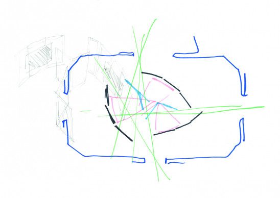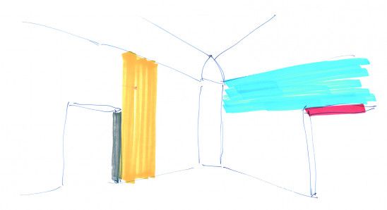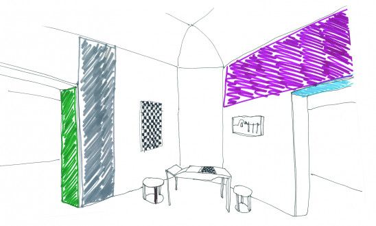 Notre rôle consistait à penser et dessiner des éléments spécifiques pour le pavillon comme l’installation de Vincent Meessen ainsi qu’une intervention chromatique en plus des éléments de mobilier. Etant donné la résonance primordiale entre les différentes oeuvres d’art - neuf artistes au total - et la posture que chacun suggère, nous voulions développer des interventions qui, à la fois, perturbent la manière traditionnelle compartimentée de présenter les oeuvres d’art et à la fois leur donner une sorte d’homogénéité.