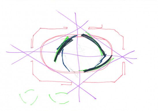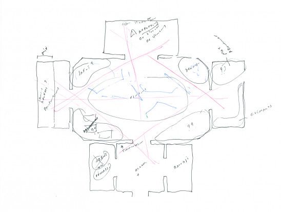 Afin de compléter ces interventions, les tableaux de Vincent Meessen situés dans l’espace principal ont été élaborés pour réguler les circulations et cadrer les vues du pavillon. Le système de signalétique, quant à lui, sort de son rôle purement informatif en envahissant le pavillon. Le système entier agit en tant que canevas pour les oeuvres d’art, leur procurant en même temps un écho aux couleurs utilisées par Guy Debord issu du mouvement des situationniste international.