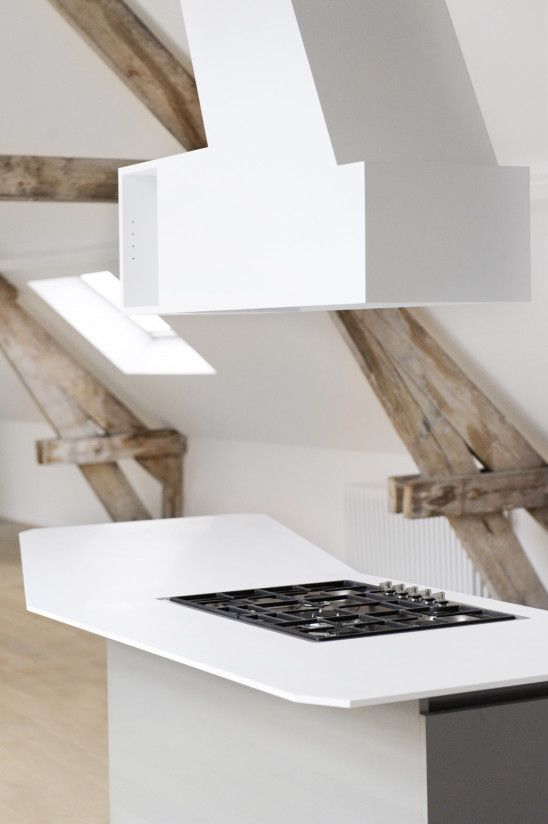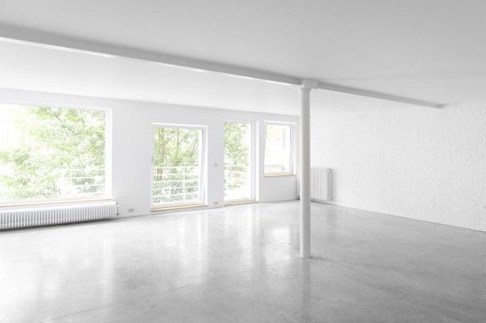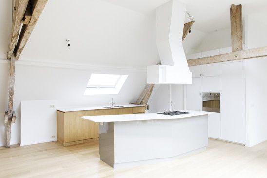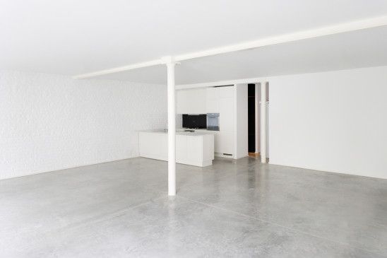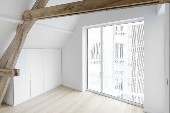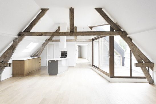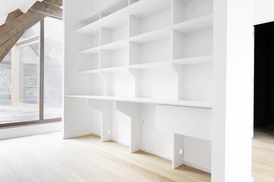 The parking space is in the basement. The ground floor is devoted to the studio as well as a part of the first floor wich is a mezzanine. This configuration frees up a large glazed surface and allows the light to come into the studio. The other part of the first level and the attic space of the second level contain the two flats measuring respectively 140 and 220 sqm.