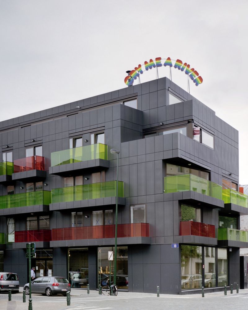 Projet d'une quarantaine de logements pour le compte d'un promoteur immobilier. Au sein d'un ensemble de 3 immeubles existants aux caractéristiques très différentes, l'ensemble se déploie le long de 3 rues (Fabriques/Senne/Anneessens). Les immeubles existants présentaient des caractéristiques hétéroclites tant au point de vue de leur gabarit, de leurs fonctions, de leur typologie et de leur style. Les logements qui y sont intégrés respectent les qualités existantes – structure, spatialité, vues, lumière, enchaînements, hiérarchies, standing -. Le projet proposait de rehausser l'immeuble d'angle existant, bâtiment néoclassique, de 2 niveaux afin de rétablir l'ordre urbain. Cette rehausse consiste en un volume sombre, rappel du nouvel immeuble qui se trouve à l'angle opposé du complexe, et de la rehausse du bâtiment central. En effet toutes les nouvelles parties sont caractérisées par la couleur noire afin d'être clairement identifiées. Une série d'éléments (balcons, volumes, immeubles ...) greffés/rapportés de tailles, de couleur et d'échelles différentes animent/complètent/rythment/unifient cette portion d’îlot hétéroclite. Le nouvel immeuble d'angle est l'articulation de 2 rues aux statuts assez différents (Fabriques et Anneessens) de même que l'entrée de la Fondation d'art privée voisine. Il propose un ensemble articulé/désarticulé qui forme la rotule entre ces divers ordres. Il souligne l'alignement d'un côté et pas de l'autre. Il respecte le gabarit de ce quartier mais en proposant une architecture résolument contemporaine.