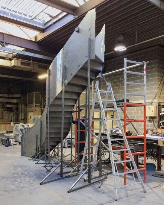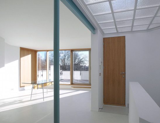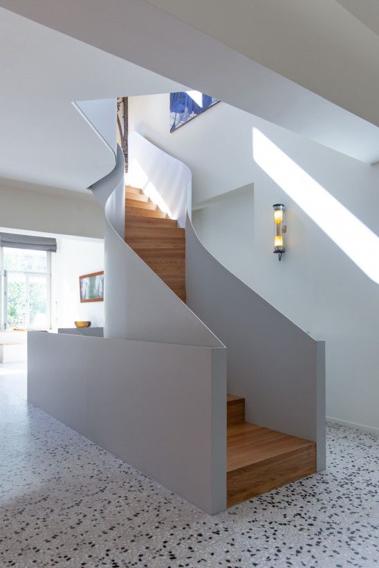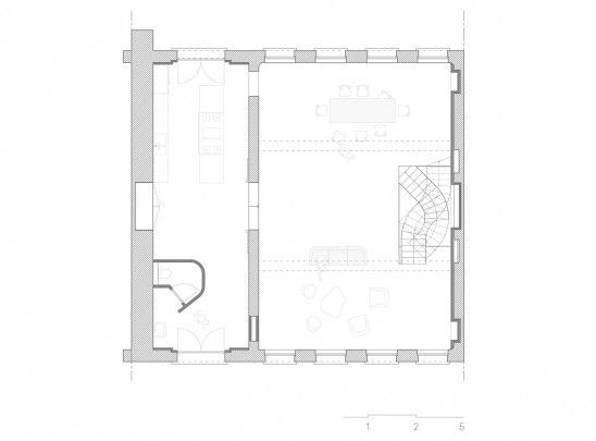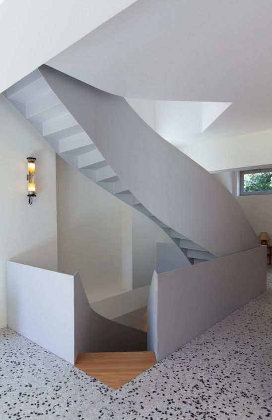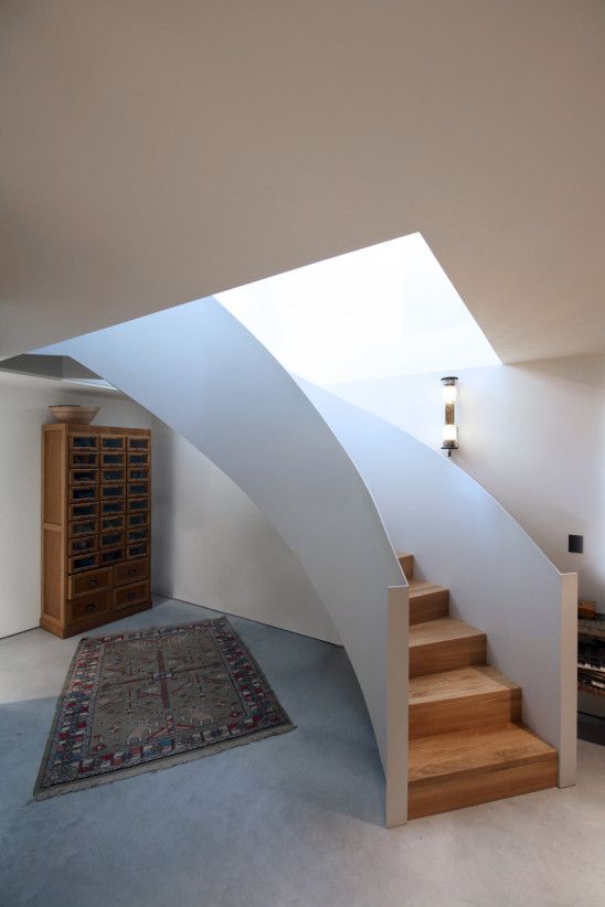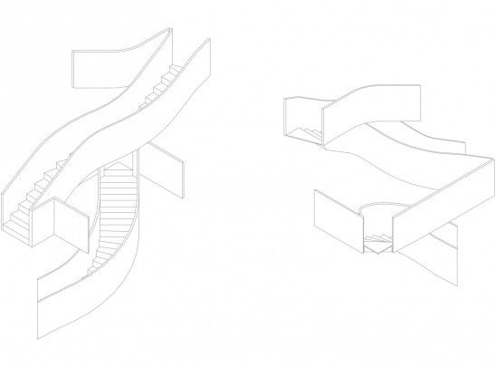 Livré casco et au vue des contraintes urbanistiques, l’intervention est essentiellement intérieure. Le rez-de-chaussée est resté simple pour laisser les larges plateaux libres d’usage. Seul un imposant escalier d’acier est suspendu au fond de la pièce. Vocabulaire acéré et angles vifs à ce niveau, il se déroule, se glisse dans les autres étages développant courbes et sinuosités.