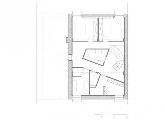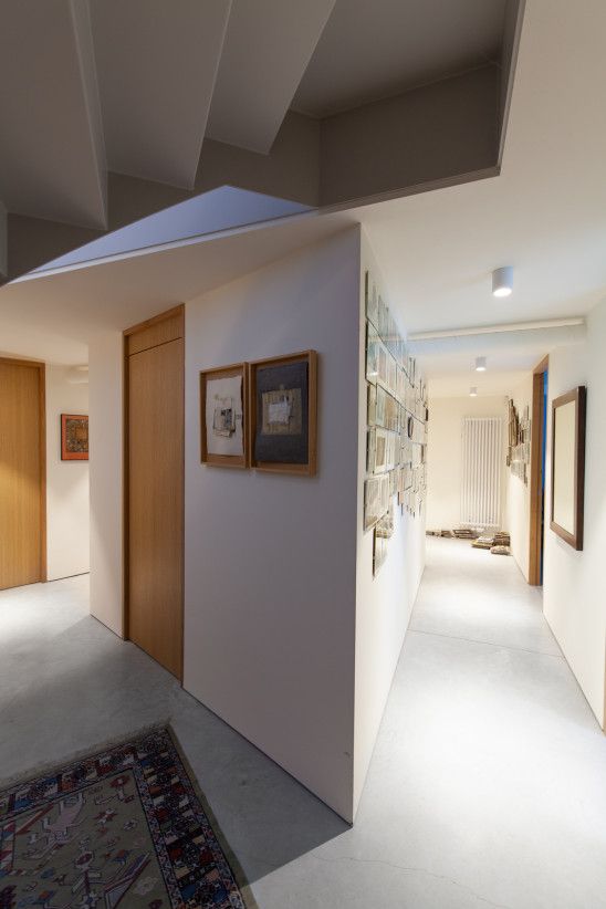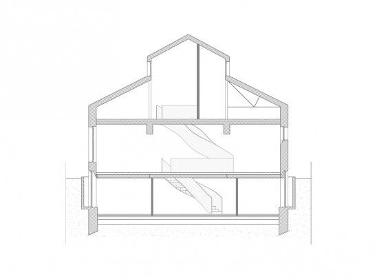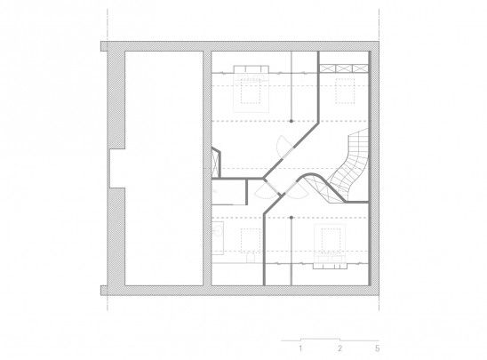 Les autres des étages adoptent le même langage, au sous-sol, les espaces sont coupés, taillés autour d’un ilôt aveugle et offrant le reste de lumière aux espaces qui le nécessitent le plus.